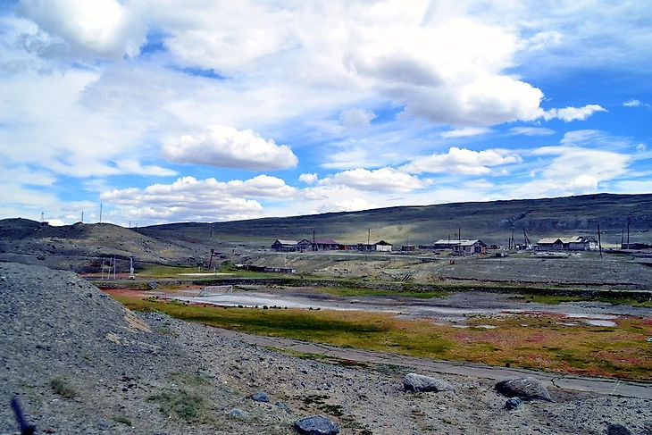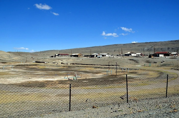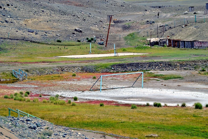 На фото один из самых необычных стадионов России. Если приглядеться, то заметно насколько ниже футбольное поле относительно окружающей местности и беговой дорожки. В 2003-м году на Алтае произошло страшное землетрясение. Посёлок Бельтир Кош-Агачского района находился в эпицентре природной стихии. Стадион провалился на несколько метров и на пару лет превратился в горячее озеро. Вода ушла обратно в подземные пустоты, поле вновь стало пригодно для игры деревенских мальчишек.