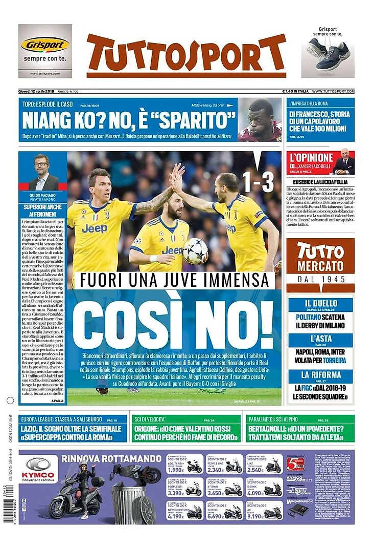 Вылетел необъятный «Юве». Бьянконери были экстраординарны, упустив невероятный камбэк: они были в одном шаге от дополнительного времени, арбитр наказал спорным пенальти и удалением Буффона из-за протестов. Роналду вывел «Реал» в полуфинал Лиги Чемпионов, взрыв ювентийского гнева. Аньелли атакует Коллину, координатора УЕФА: «Его тщеславие заканчивается ударом по итальянским командам». Аллегри упрекает в не данном пенальти на Куадрадо в первом матче. Дальше прошла также «Бавария»: 0:0 с «Севильей».