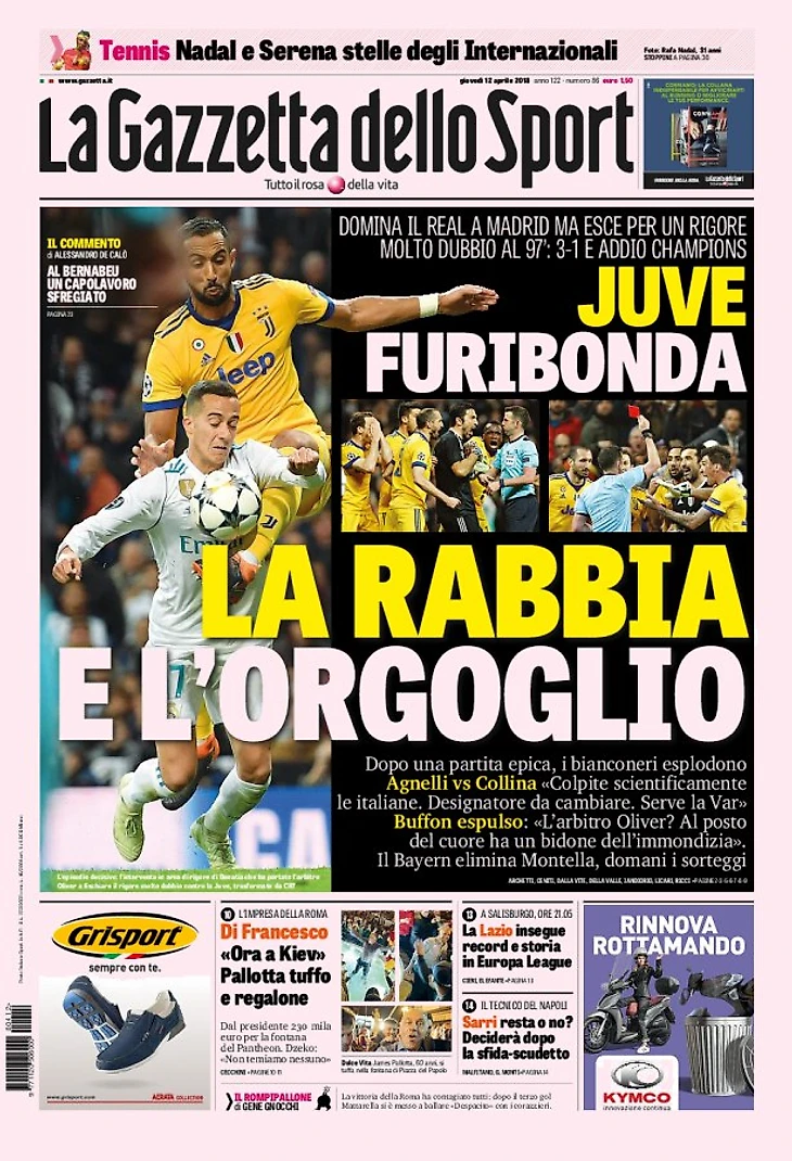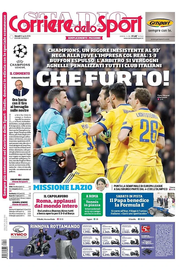 «Юве» разъярён. Доминирование над «Реалом» в Мадриде, но вылет из-за очень сомнительного пенальти на 97 минуте: 3:1 и прощай Лига Чемпионов. После эпического матча Бьянконери взорвались. Аньелли против Коллины: «С научной точки зрения удар по итальянцам. Нужно сменить координатора. Необходимы видеоповторы». Буффон удалён: «Арбитр Оливер? На месте сердца у него мусорное ведро». «Бавария» выбила Монтеллу, завтра жеребьёвка.