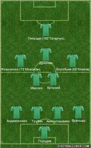 "Краснодар": 1. Городов. 15. Враньеш. 5. Амисулашвили. 55. Тубич. 3. Анджелкович. 22. Жоаозиньо (10. Мовсисян, 73). 84. Дринчич. 24. Кульчий. 28. Воробьев (Комков, 65). 26. Марсио. 9. Пикущак (14. Татарчук, 100).