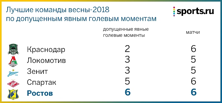 «Игрой в обороне доволен, до гола уж точно», – рассказал Карпин после игры с «Локомотивом». В пяти весенних турах по воротам «Ростова» нанесли 71 удар – больше били только соперники «Уфы» (85) и СКА (116). Но число ударов смущать не должно – большинство наносилось из не очень опасных позиций. «Ростов» допустил всего 6 явных голевых моментов (один из них – пенальти) – это хороший результат для матчей против топов.