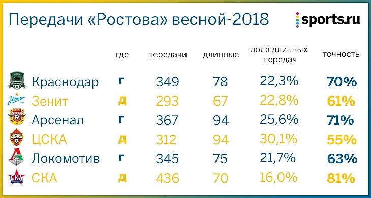 Из-за большого количества длинных передач «Ростов» не отличается высокой точностью, но разница в числе и качестве пасов в домашних и гостевых матчах все равно очень показательна.