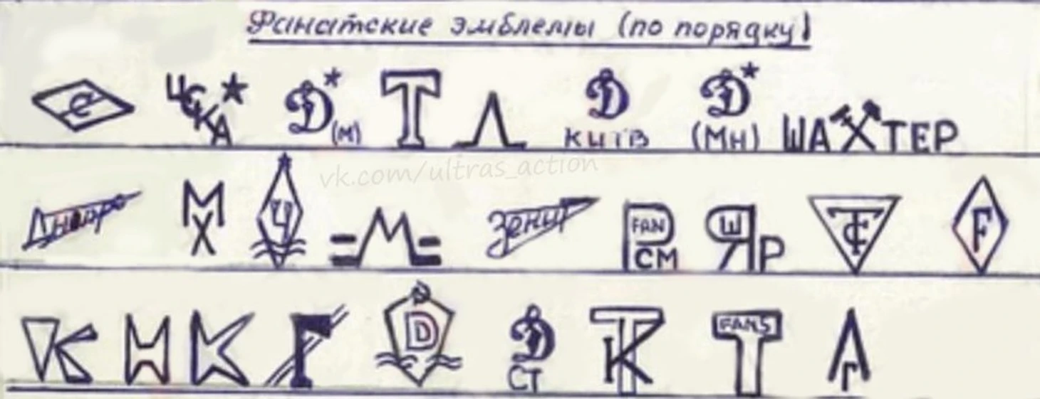 На картинке - эмблемы советских фан-движений, нарисованные ручкой и опубликованные в 1990 году в первом номере фанзина "Русский Фан-Вестник". Эти логотипы красовались на стенах домов всех городов, куда приезжали на выездные матчи представители данных движух, вызывая недоумение у местных жителей.