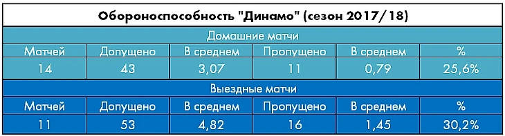 Вместе с тем, в гостевых поединках «Динамо» защищается значительно хуже и пропускает почти вдвое чаще, чем дома (причем вплоть до последнего тура эта разница была почти трехкратной). Разница по набранным очкам тоже вполне коррелирует с этой статистикой – 50% очков на своем стадионе и только 27,3% на поле соперника.