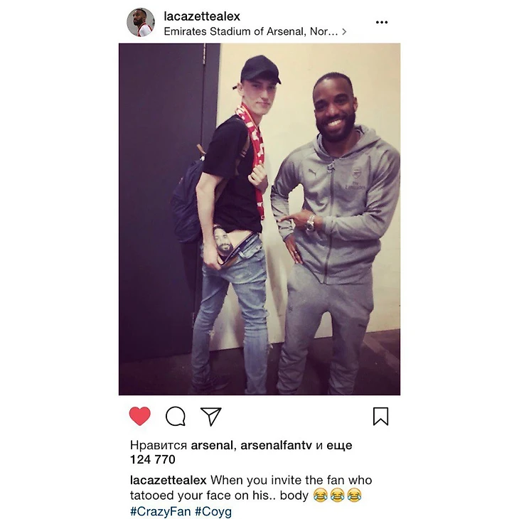 Фанат футболиста продемонстрировал «канониру» свою татуировку с изображением лица нападающего на очень необычном месте.