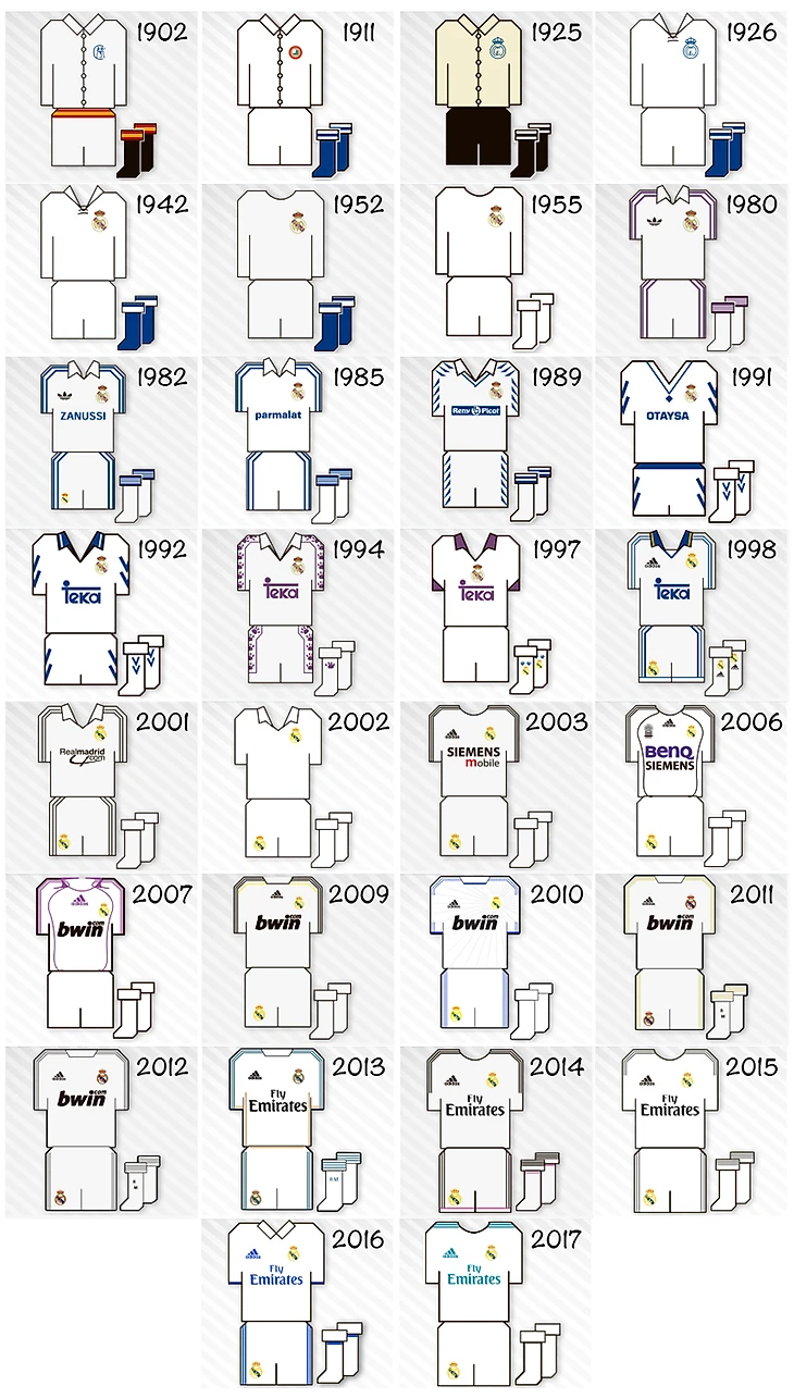 Особняком стоит сезон 1997-1998, когда клубная эмблема зачем-то оказалась посередине футболки. Впрочем, именно в этой форме «Реал» выиграл Лигу чемпионов впервые за 32 года.