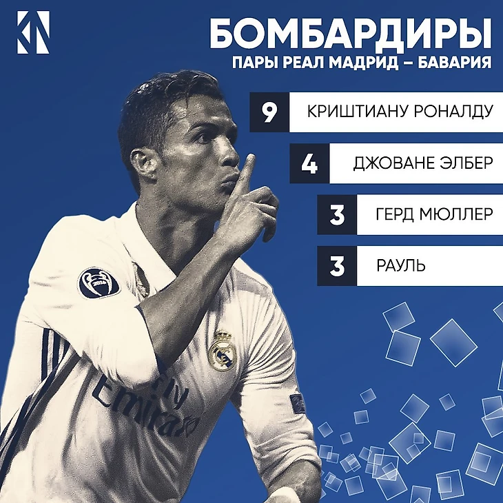 • Криштиану Роналду в трех последних матчах с "Баварией" забил семь мячей, а всего на его счету девять голов в шести играх.