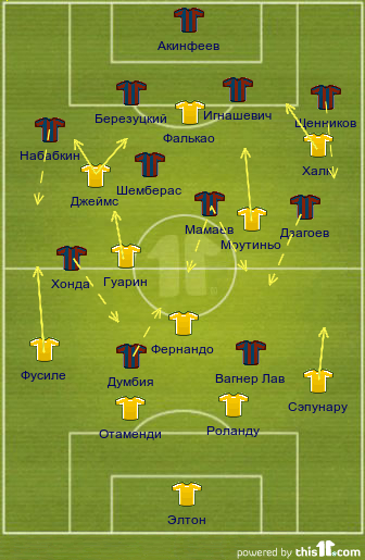 Шемберас, стоя на прямых ногах, провожает взглядом мяч, в то время как Фалькао делает рывок, что бы замкнуть прострел Халка. И если бы не уверенная игра Щенникова в этом эпизоде, то гол бы мог быть забит на 5 минут раньше.