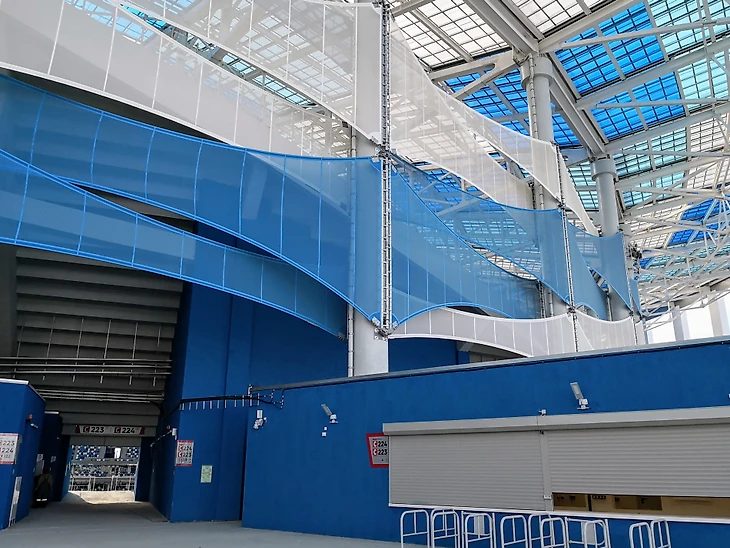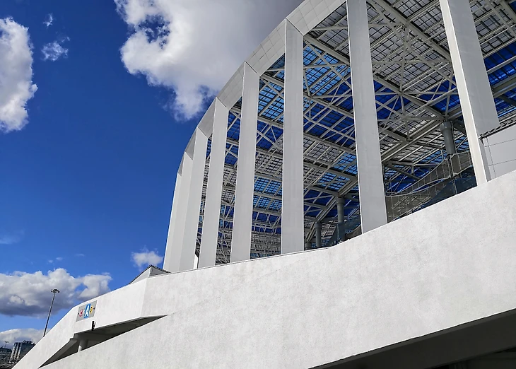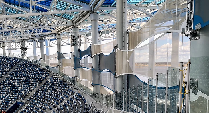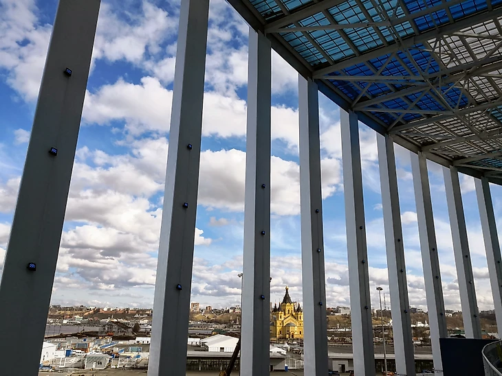 Внешнее оформление стадиона играет еще и роль защиты от ветра. Вместо ставшего уже традиционным пластика и металла, в Нижнем решили использовать синтетические мембраны. Их обслуживать проще, они дешевле, практичнее. Хотя и возникают вопросы, насколько хорошо они защитят от ледяных ветров зимой. Но благодаря этому решению стадион выглядит воздушным не только издалека, но и внутри.
