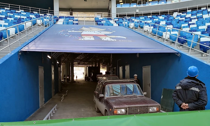 А внутри вовсю кипела подготовка к тестовому матчу “Олимпийца” и “Ротора”. Аврал спровоцировала и делегация иностранных журналистов, которая должна приехать на игру, совмещенную с официальным открытием стадиона. Поэтому не стоит удивляться тому, что прямо у углового флажка припаркована Лада седан цвета “Баклажан”.