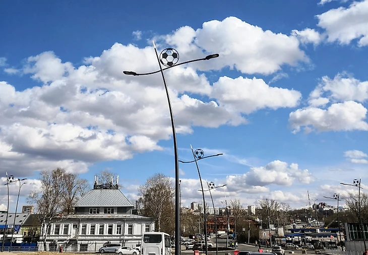 Очень милыми оказались мачты освещения вокруг стадиона. Каждая из них дополнена футбольным мячом. Казалось бы, мелочь, а сразу создает настроение.