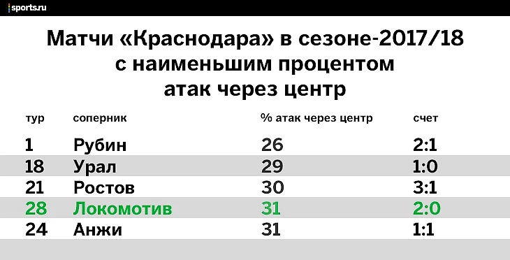 «Краснодар» отказался от игры через центр. Стиль «Краснодара» давно изучен всеми соперниками – большое количество атак через центр. В среднем по сезону-2017/18 «Краснодар» проводит 34% через середину – лучший результат лиги с большим отрывом от «Спартака» (29%).