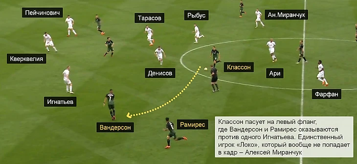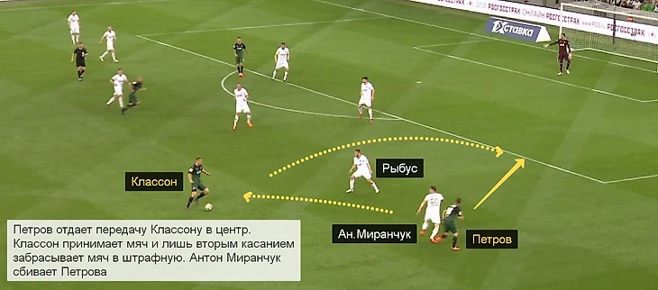 Классон отдавал передачу не первым касанием, но Антон Миранчук все равно не успел за Петровым. Это большой минус «Локо» по сезону – атакующая четверка слабо действует в обороне. В РФПЛ этим почти никто не пользуется, но на более высоком уровне это уже привело (и приведет в Лиге чемпионов, если «Локо» не изменится) к серьезным неприятностям.