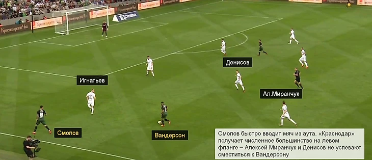 До перерыва Вандерсон Масиэл и Рамирес разрывали правый фланг «Локо» – Игнатьев не справлялся с соперниками, а Кверквелия и Денисов не всегда успевали на подстраховку (хотя Саба подчищал за партнерами больше остальных). Трудности «Локомотива» были связаны не только с наличием Игнатьева справа (по сезону Владислав неплохо справляется с оборонительными обязанностями), но и с сильными недоработками Алексея Миранчука сзади. Именно он действовал ближе к флангу Рамиреса и Вандерсона при позиционных атаках «Краснодара».