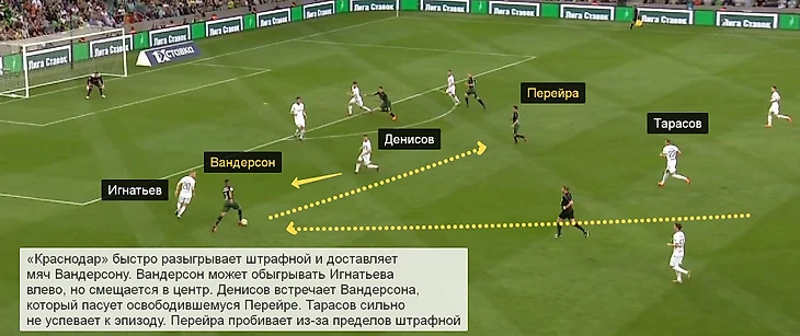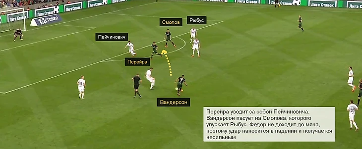 На 44-й минуте Смолов упустил лучший шанс первого тайма. Он тоже пришел с фланга Вандерсона – бразилец убежал со своей половины поля, обыграл Игнатьева на встречном движении и выкатил мяч Смолову. Федор был абсолютно один – Пейчинович играл по Перейре, а Рыбус занимал самую удобную позицию для просмотра эпизода.