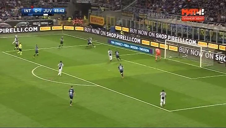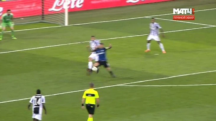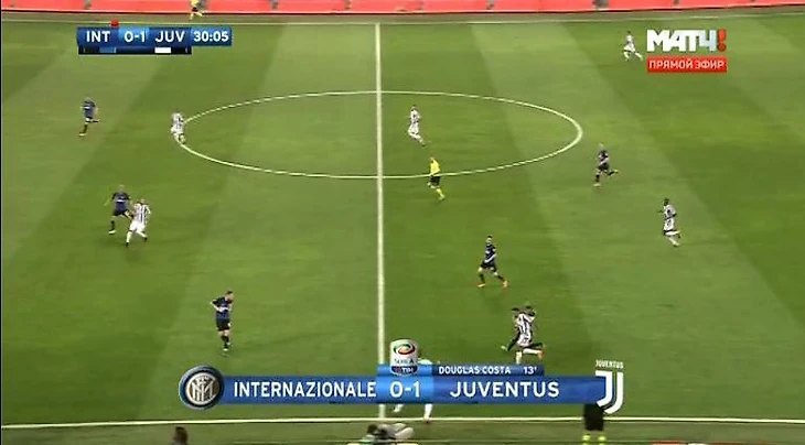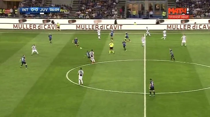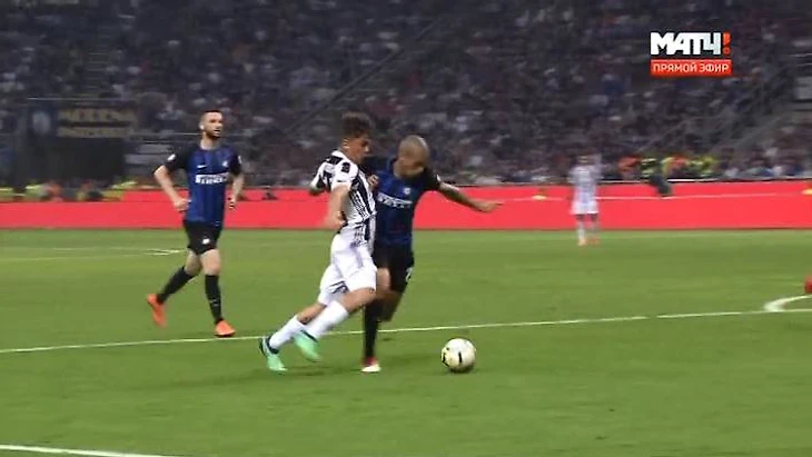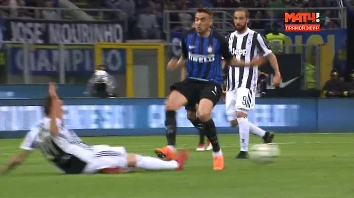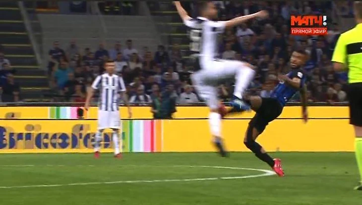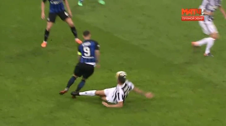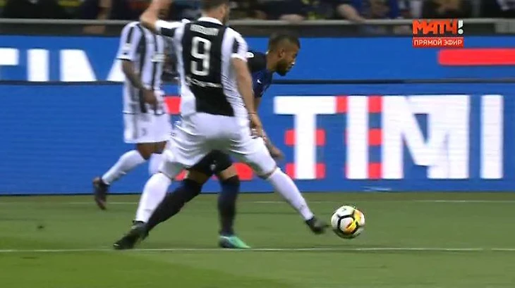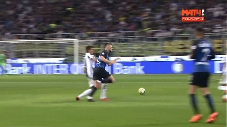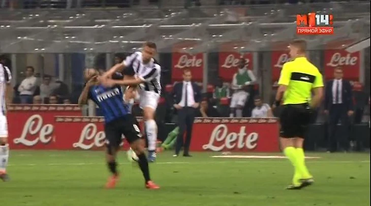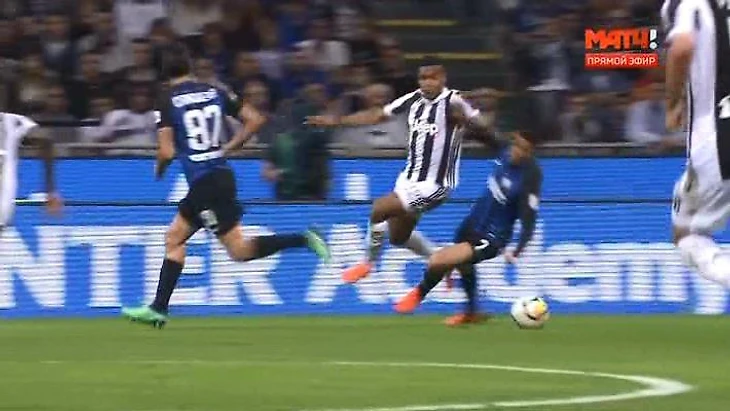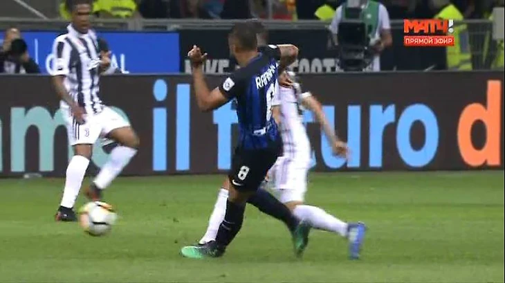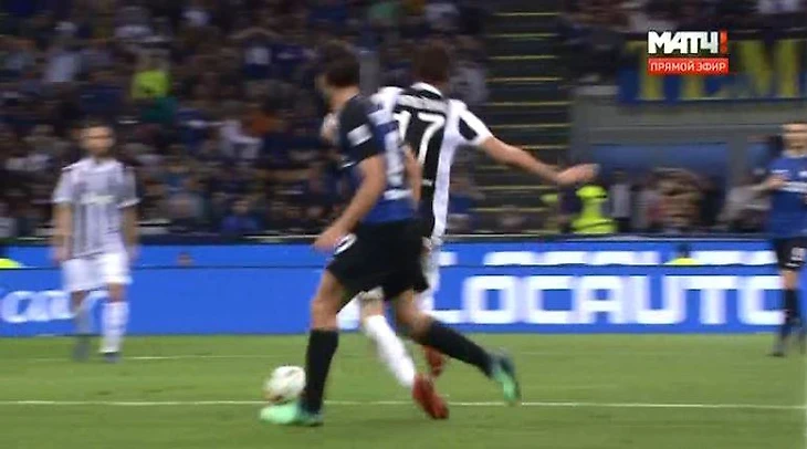 4 минута. "Ювентус" включил высокий прессинг, "Интер" решил выходить из-под него через левый фланг. Мяч оказался у Ивана Перишича, которого ударом по ноге "догнал" Хуан Куадрадо. Справедливая желтая карточка уже на первых минутах встречи.