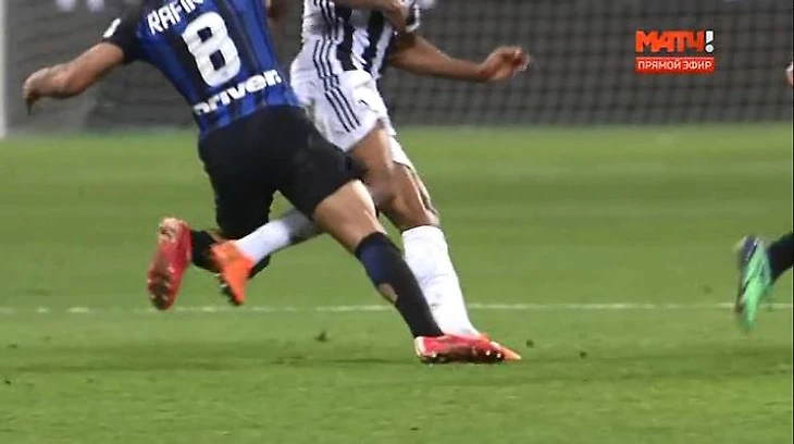 15 минута. Не сразу понятно, что произошло в принципе. Защитник "Интера" ошибается в передаче, Весино пропускает мяч, Манджукич стелется за ним в подкате и резко хватается за ногу. Орсато все видел и не задумываясь дает желтую карточку. Но затем после подсказки идет смотреть повтор и дает красную. На первый взгляд показалось, что "горчичника" было достаточно, но когда показали ногу хорвата сомневаться в правильности решения арбитра не стоит. Куда смотрел удаленный игрок, когда фолил, непонятно. Возможно, Орсато также впечатлило повреждение и то, что это лодыжка - очень травмоопасное место.