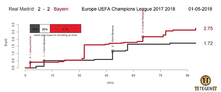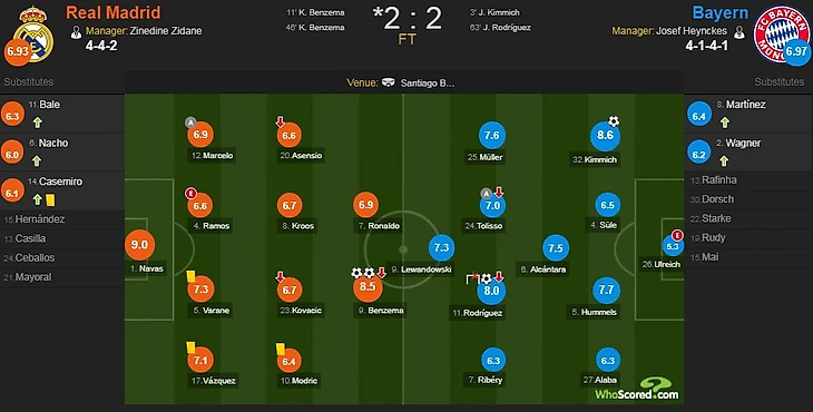 У «Реала» на 1.03 бала меньше чем у «Баварии». Во время матча показалось, что у «Реала» не было моментов, но они были. Например: промах Роналду с 5 метров или сэйв Ульрайха после удара всё того же Роналду.