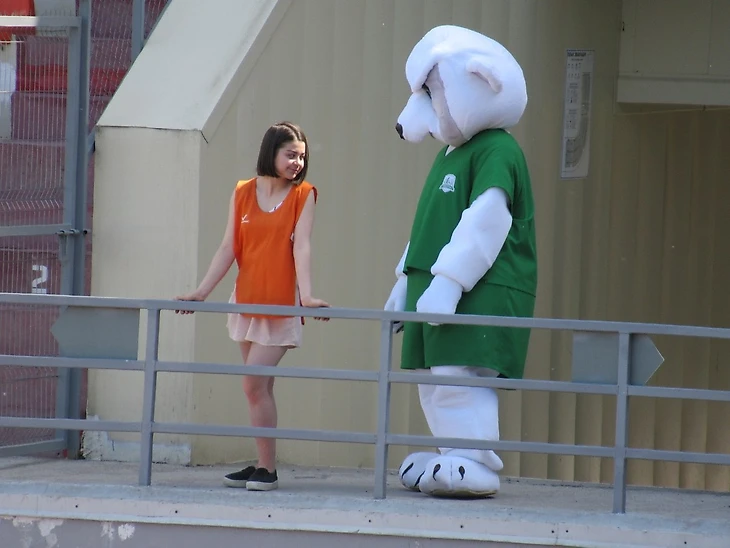 То и дело вдоль трибуны вышагивал клубный маскот «Эл». Вышагивал, надо сказать, по-армейски - с чеканкой шага, правильным движением рук и идеальной осанкой. Проходя по маршруту в очередной раз, он не забывал протягивать маленьким фанатам огромную искусственную лапу, а те с неподдельным интересом тянули свои руки в ответ. Медведь интересовал их куда больше, чем 22 мужика на футбольном поле. Не забывал мишка и общаться девушкой-стюардом. С виду это напоминало сказку «Маша и медведь».