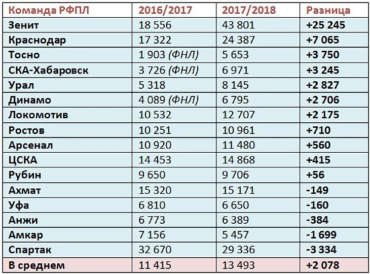 Средняя домашняя посещаемость клубов РФПЛ, после 29 тура: