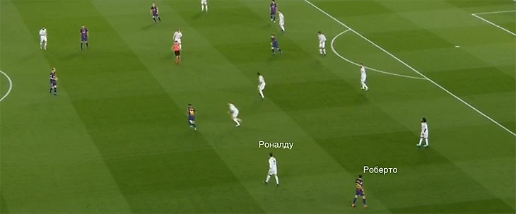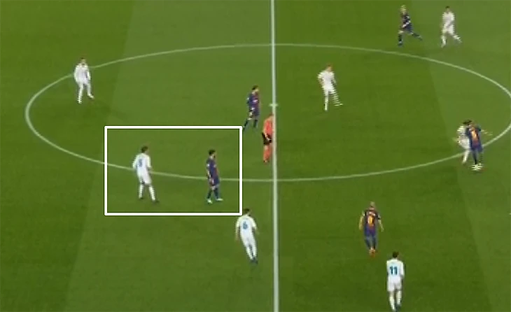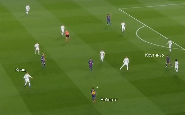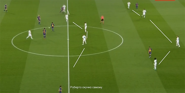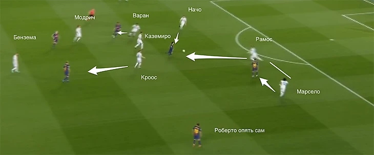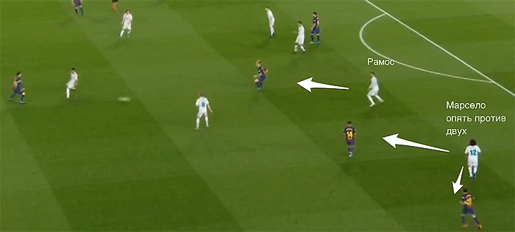 В таких ситуациях, Кроос и Марсело раз за разом оказывались в меньшинстве против 3-4 футболистов Барселоны (Коутиньо, Роберто, Месси, Ракитич)