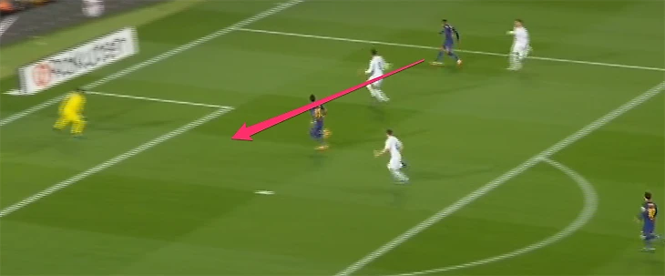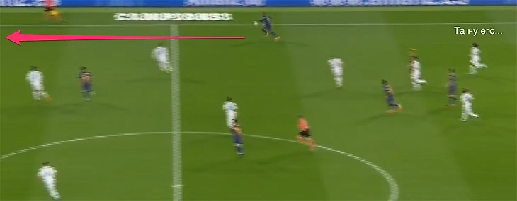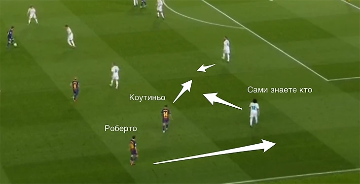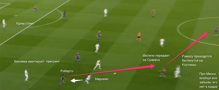 Не совсем удачный прессинг Реала + образцово-показательный выход Барсы из-под него подарили нам прекрасный гол. С чего началось? С того, что при прессинге Марсело вышел на Роберто, которого, по идее, мог бы встретить и Криш