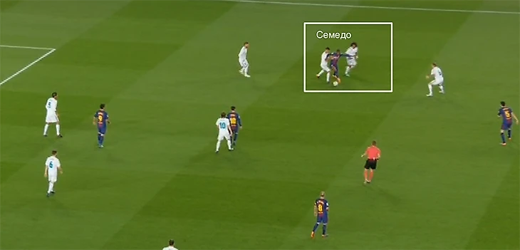 Все было бы почти радужно для Реала, если бы парень с микрофоном на голове иногда не решал подышать теплым Барселонским воздухом.Здесь он создает коридор для ракетного забега Семедо