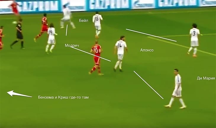 Решения в защите: Описывая защитные построения, я не могу не разделить игру на До и После сами знаете чего.Реал, теоретический игравший по 4-3-3, конечно же, практически не видел Роналду в защите. Криш и в лучшие годы не сильно любил защищаться, а сейчас... А сейчас он понимает, что не сможет выжигать соперников на чужой половине, не изолировавшись от игры в отборе. Поэтому, в основном мы видели очень перекошеные на правый фланг 4-4-2 в защите.