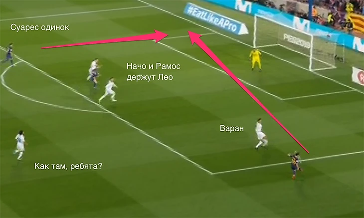 2) Начо пошел на Месси, за которым не успел Рамос;3) Суарес оказался абсолютно одиноким.