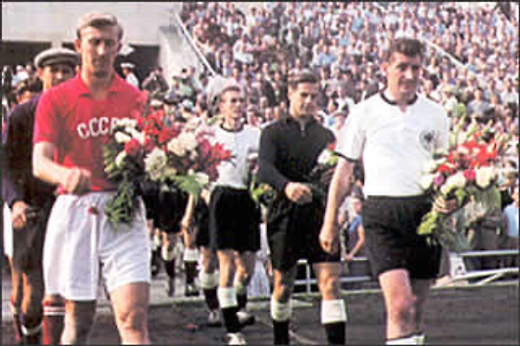 Команды СССР и ГФР выходят на матч с только что врученными им цветами. Кстати, поговаривают, что в те времена в Союзе это была такая традиция, когда соперники перед игрой одаривали друг друга букетами цветов.