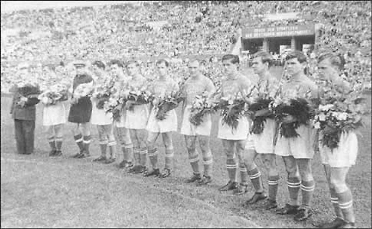 Вот они, триумфаторы. Честь им и хвала! Футболисты сборной СССР перед первым матчем в Москве 21 августа 1955 года. Они ещё не знают, как завершится игра, и потому очень волнуются.