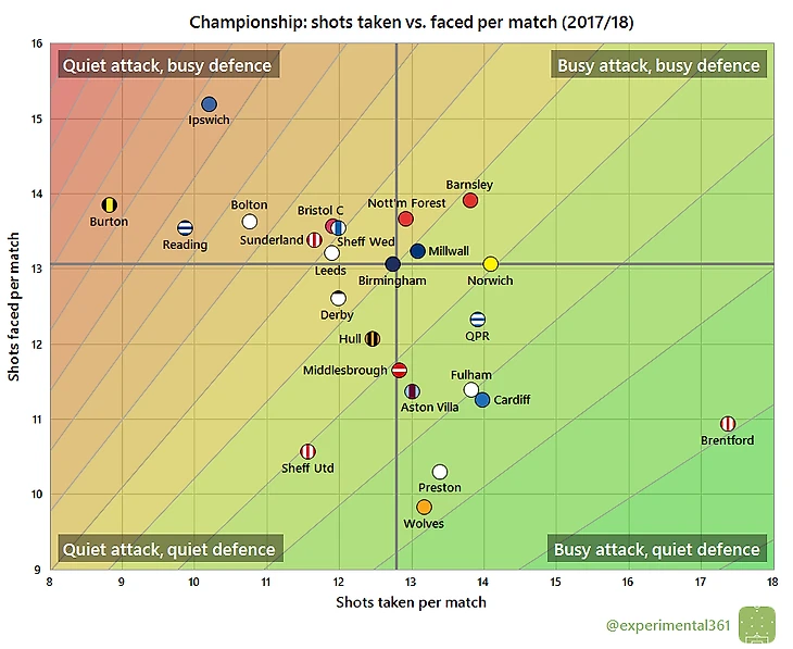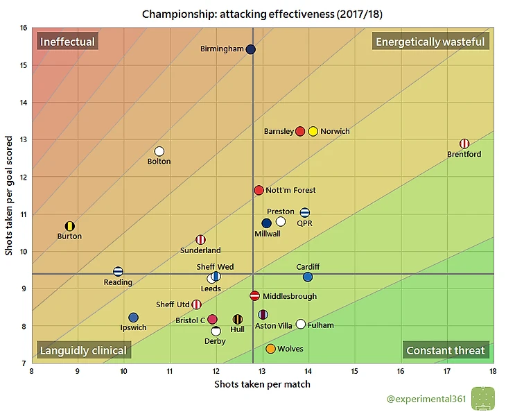 График показывает соотношение среднего количества ударов, необходимых для того, чтобы забить гол (вертикальная шкала) и среднего количества нанесенных ударов по воротам противника (горизонтальная шкала).