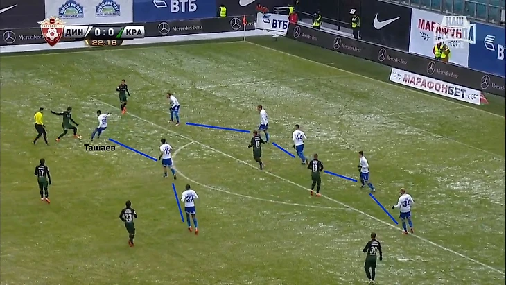Ташаев оказался на позиции центрального полузащитника при позиционной обороне.