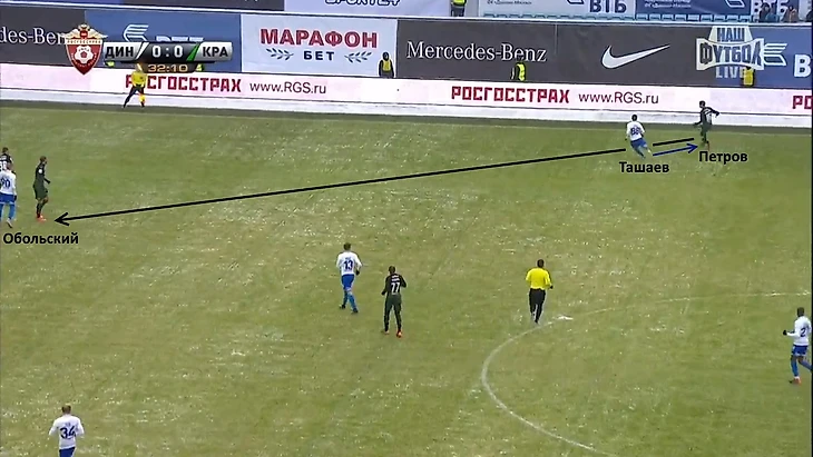 Ташаев своим резким рывком заставил Петрова принимать поспешное решение. Сергей отдал неаккуратный пас, который перехватил Обольский.