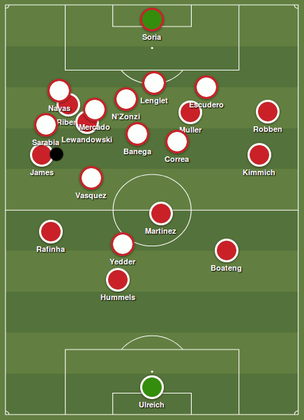 Кроме того смена флангов атаки заставляет защищающихся много перемещаться, менять опекаемых игроков и кто-то из них может оказаться забытым. Да и сами игроки в штрафной обычно не промах: прекрасно реализующий фланговые передачи Левандовски, его 194-сантиметровый сменщик Сандро Вагнер, часто остающийся свободным Томас Мюллер, способный неожиданно ворваться в штрафную Артуро Видаль и другие.