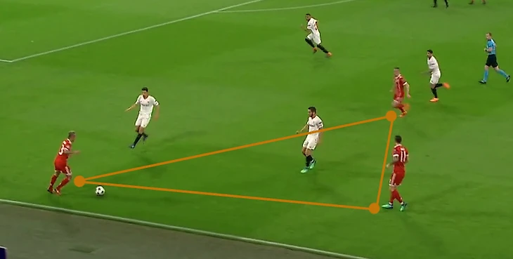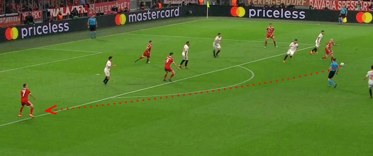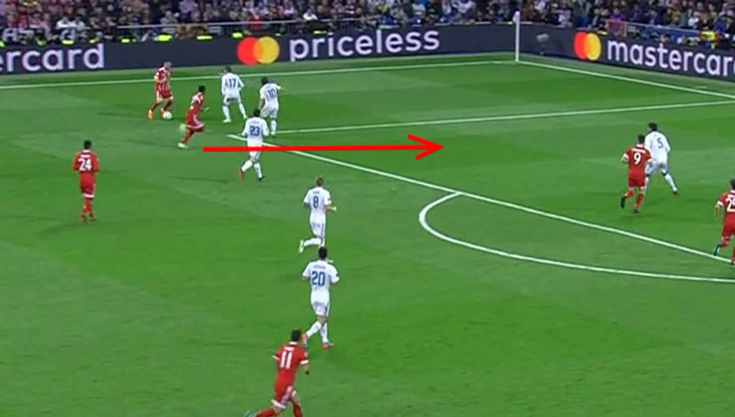 Когда игроки соперника стягиваются к флангу и у Баварии не получается создать численного преимущества, обычно это означает, что на противоположном краю поля остался свободный игрок и на него следует немедленный перевод.