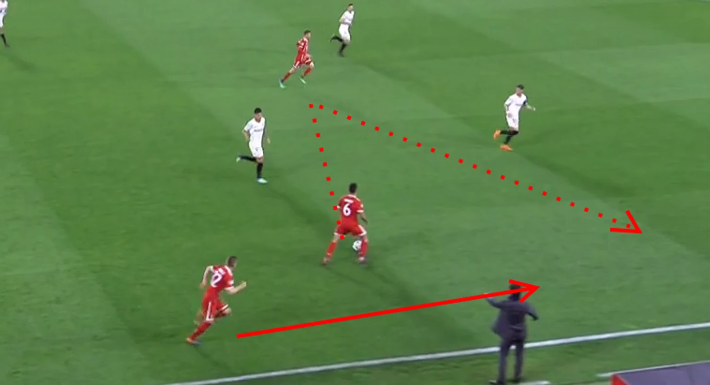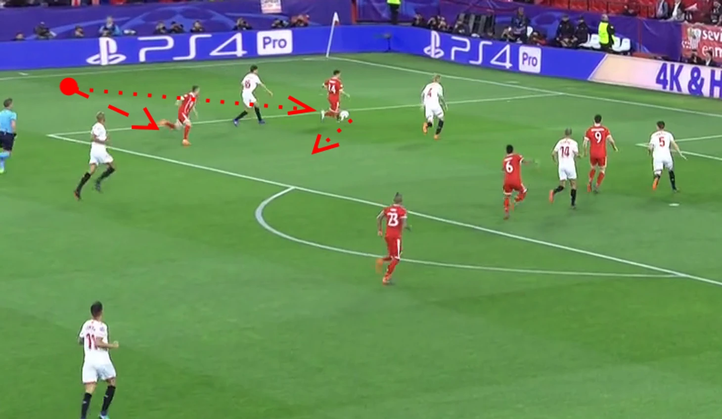 Нужно сказать, что взаимодействие вингер-фуллбек в Баварии построено достаточно гибко. Во многих командах роли распределены чётко - вингер смещается в центр, оставляя бровку защитнику или, наоборот, вингер играет максимально широко, защитник заполняет полуфланг. В Мюнхене такого разделения нет и крайние игроки меняются местами постоянно.
