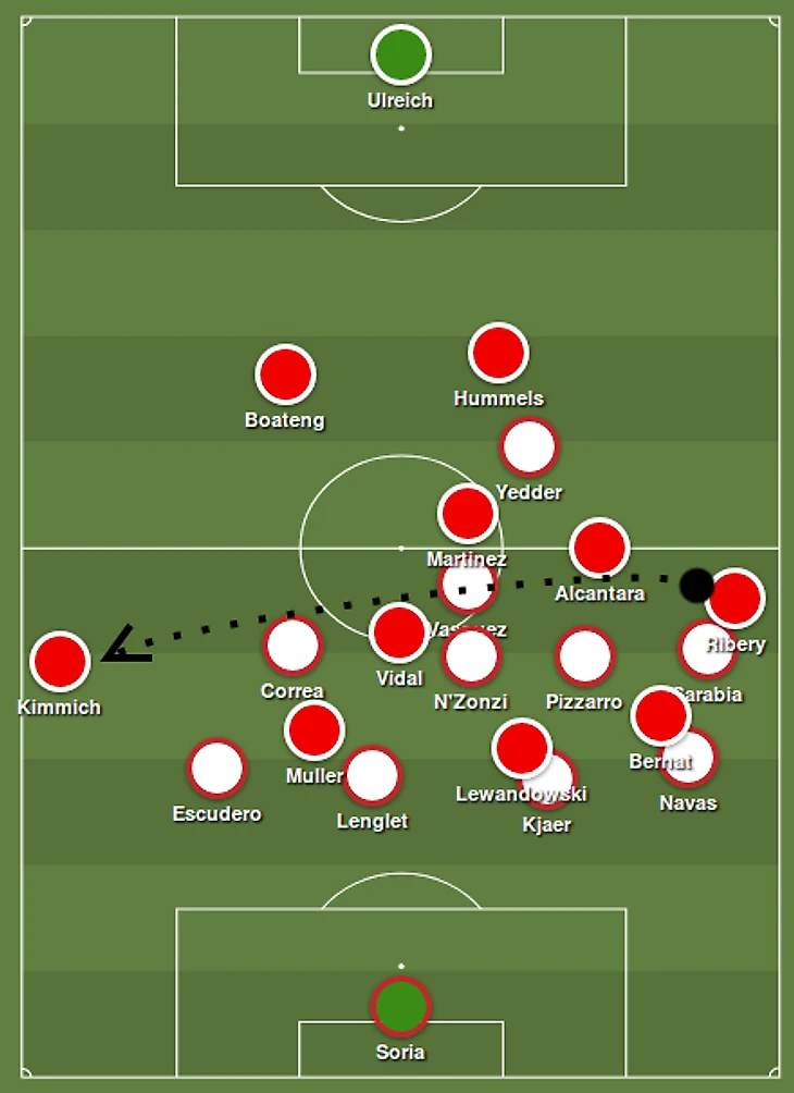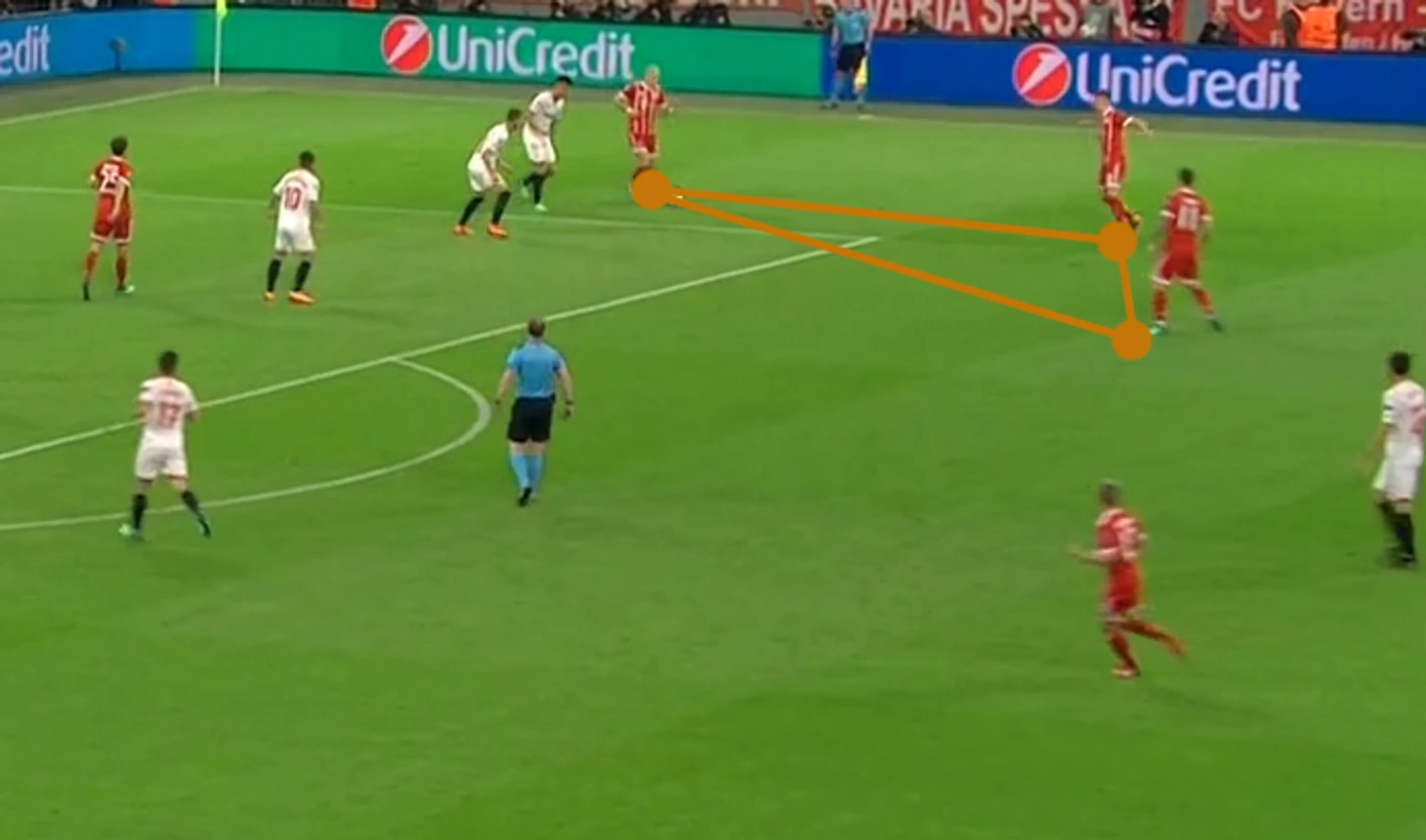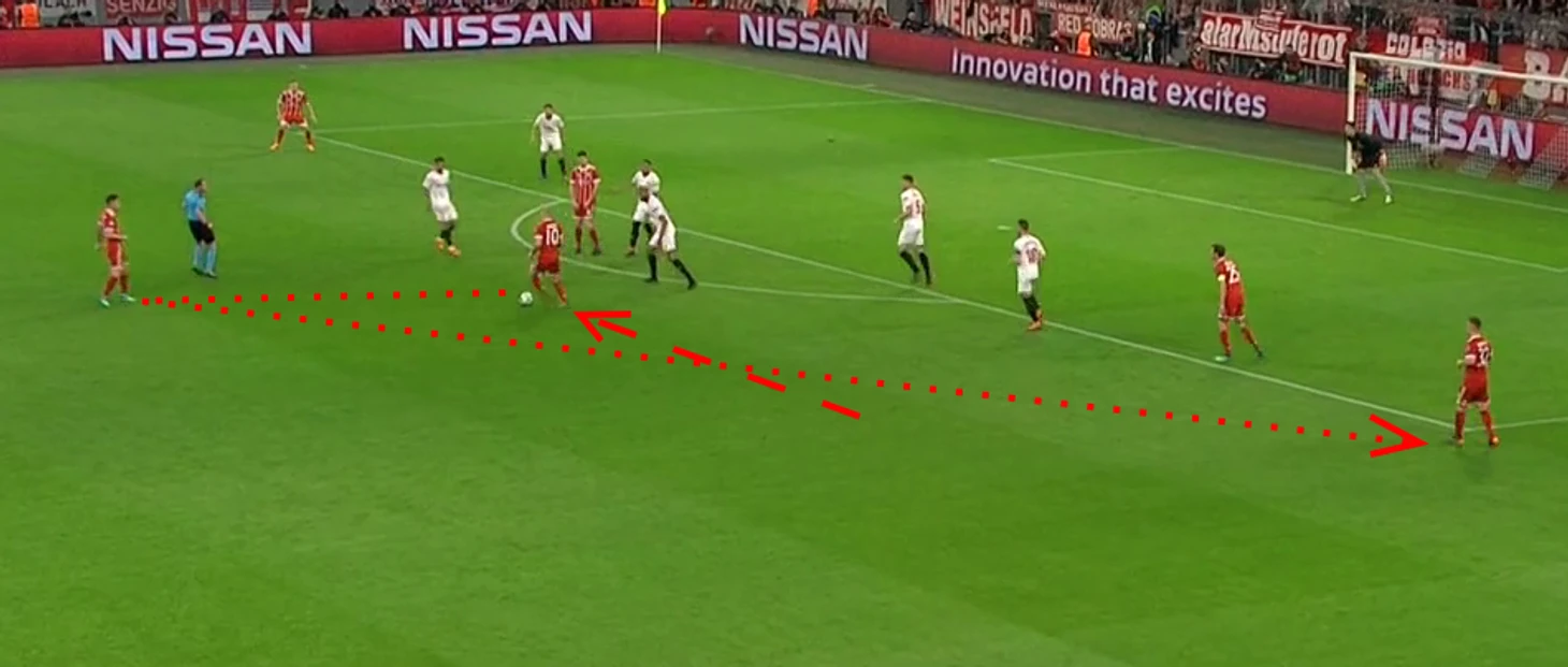 В мюнхенском клубе собраны большие мастера почти на всех позициях. Оба основных центральных защитника - Хуммельс и Боатенг, обладают просто замечательным первым пасом и способны точно отправлять мяч на большие расстояния. Не меньшие специалисты в области точных передач играют и в центре поля: Хамес Родригес, Тьяго Алькантара, да и вообще любой, кого ни возьмёшь. Такой подбор кадров позволяет баварцам в каждом матче совершать большое количество переводов как из центра на фланг, так и с одного фланга на другой.