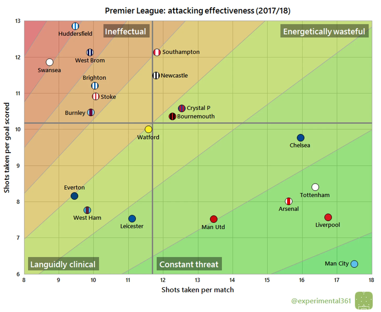 График показывает соотношение среднего количества ударов, необходимых для того, чтобы забить гол (вертикальная шкала) и среднего количества нанесенных ударов по воротам противника (горизонтальная шкала).