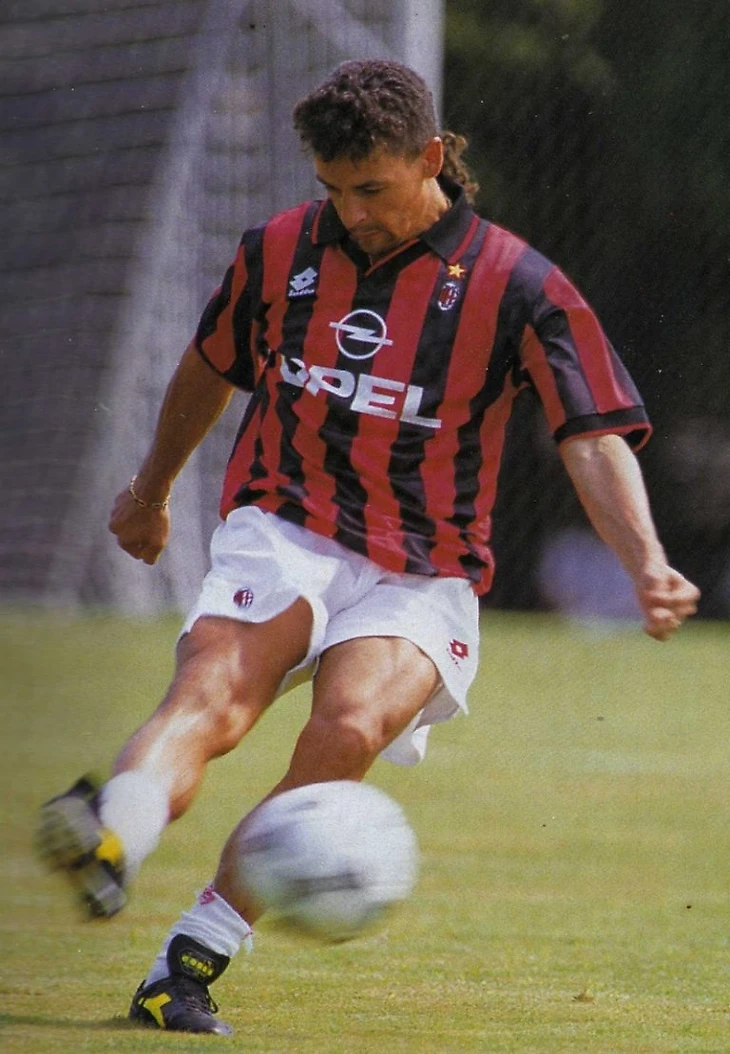 В рядах туринцев Роберто Баджо выходил против rossoneri десять раз , из них однажды появлялся в кубковом противостоянии , но оно не принесло голов ни футболисту , ни соперникам (Милан-Ювентус 0:0 , 31 марта 1992 , первый матч полуфинала). Трижды отправлял мячи в сетку вратарей своей будущей команды Роби , стоит выделить потрясающий гол в победном для «Старой синьоры» сезоне. Взятие ворот Себастьяно Росси особо подчеркнуло мастерство Божественного Хвостика и показало его понимание голевого момента , а выигрыш на «Делле Альпи» 30 октября 1994 у действующего чемпиона стал мощным рывком к скудетто подопечных Марчелло Липпи.