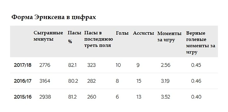 Играя временами чуть глубже обычного, в этом сезоне Эриксен несколько понизил свои показатели по созданию моментов – сейчас эта цифра составляет 2,56 за игру, тогда как в 2016/17 было 3,52, а за год до того – 3,52. В то же время его показатель по созданию острых голевых моментов остается таким же высоким, как и раньше – это то, что всегда было его сильной стороной.