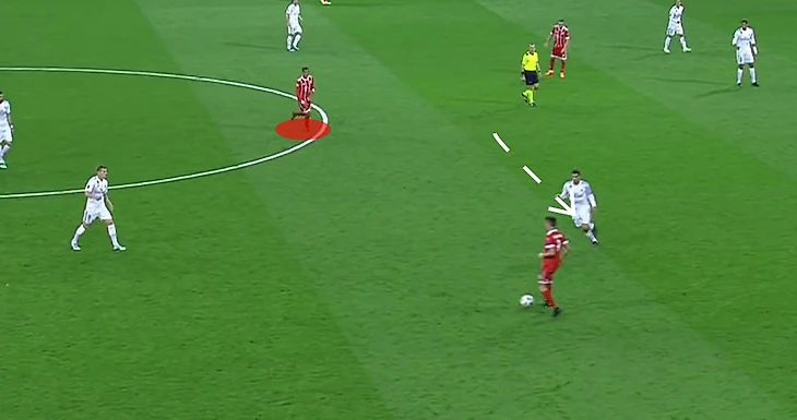 Рассмотрим изображение выше - Мюллер для прессинга располагается достаточно высоко. Это в целом нормально - один или двое из пятёрки полузащитников Баварии всегда выдвигаются в прессинг, но делают это более согласованно и так, чтобы их можно было подстраховать. Здесь же Алькантара никак не может страховать одновременно и Мюллера, и Толиссо, который атакует Модрича.