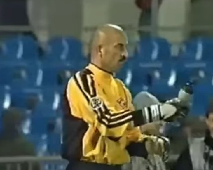 В этом моменте прекрасно все: как Черчесов "обостряюще" разыгрывает мяч, в то время как команда уступает 0-2, какую клоунаду он затем исполняет, как он считает ниже своего достоинства бежать за мячом, который катится в штангу и как он особо не напрягается, когда игроки Валенсии закатывают мяч в ворота из его вратарской с метра. И конечно особый шик это как он предлагает кому-то попить водички - в этом опять есть что-то сюрреалистичное.