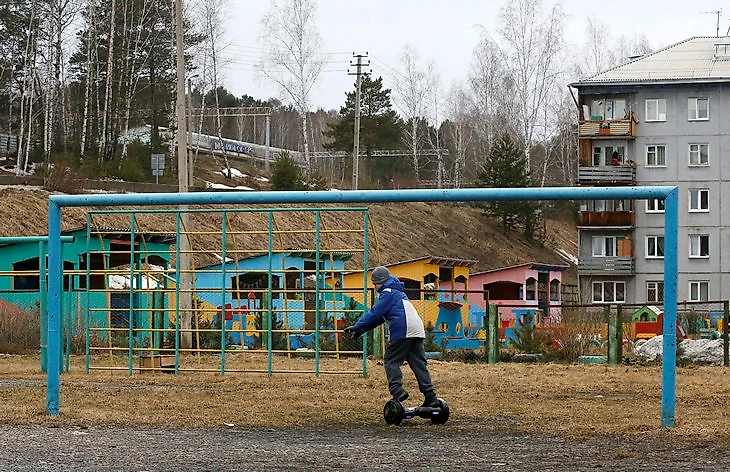 В апреле в Дивногорске еще не играют в футбол, зато ездят перед воротами на гироскутере.