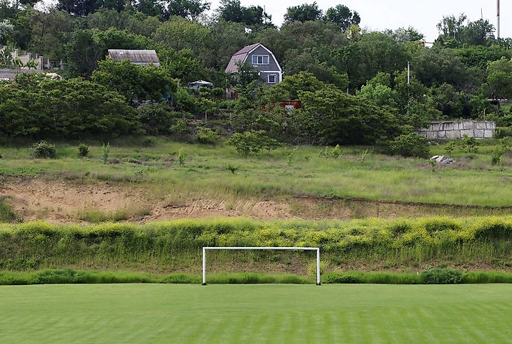 Шикарный футбольный пейзаж в Севастополе. Даже если мяч вылетел далеко за поле, сбегать за ним – одно удовольствие.