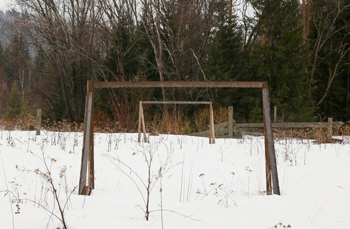 Ворота в подмосковном поселке Чкаловский окружены одуванчиками, но, судя по утоптанному полю, совсем не заброшены.