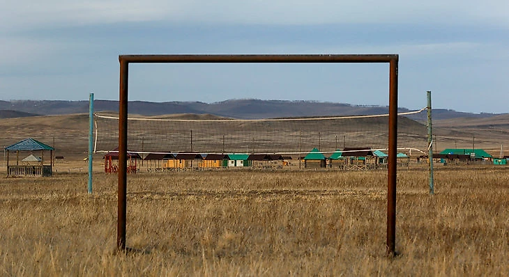 Целый спортивный комплекс в Хакасии – футбольное поле, плавно переходящее в волейбольную площадку. При желании вратарь может смотреть два матча одновременно.