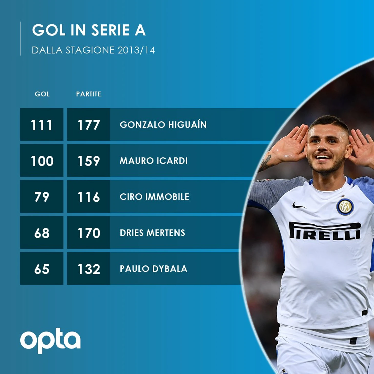 С момента своего дебюта за «Интер» (сезон 2013/14) Мауро Икарди забил 100 мячей в рамках Серии А, что является вторым результатом за этот период после 111 мячей Гонсало Игуаина