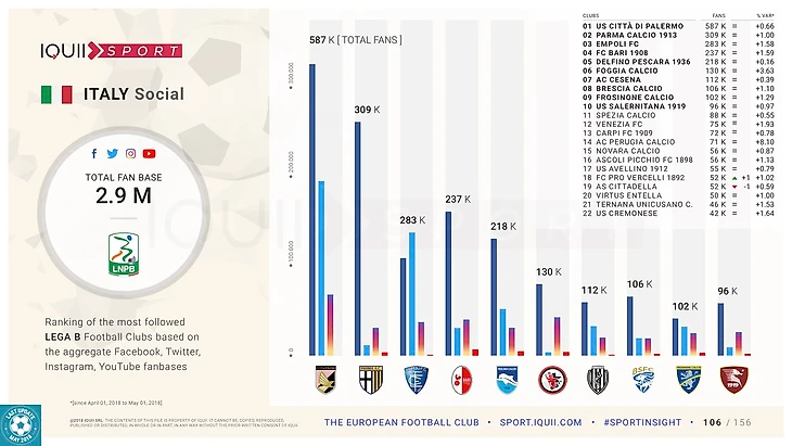 Наибольшее суммарное число подписчиков в социальных сетях у #Палермо 587 000 поклонников, далее идут #Парма 309 000 и #Эмполи 283 000. Кстати #Парма и #Эмполи в этом году оформили возвращение в Серию А! #серия А Италия
