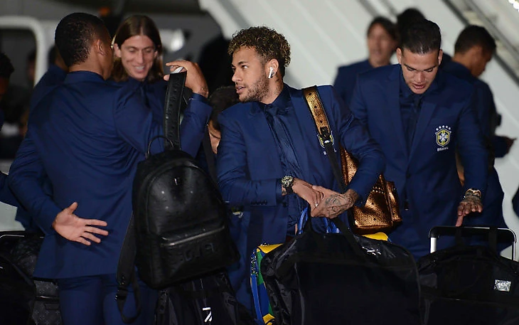 Неймар – главная звезда сборной, и когда он спустился с трапа, все обратили внимание на золотой рюкзак бразильца.